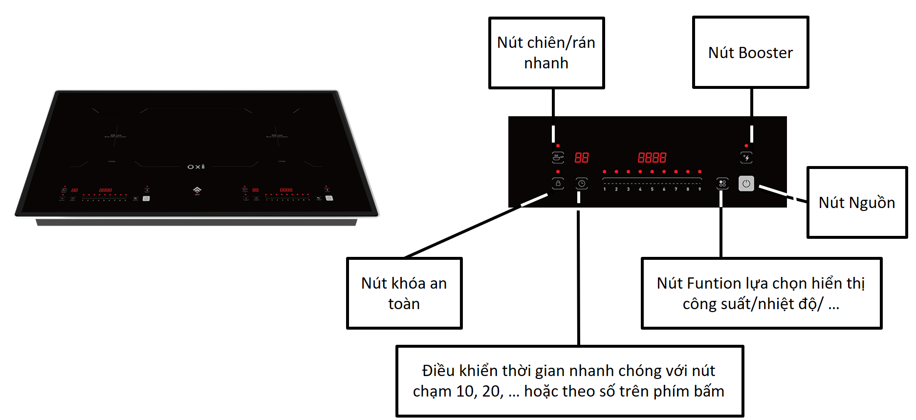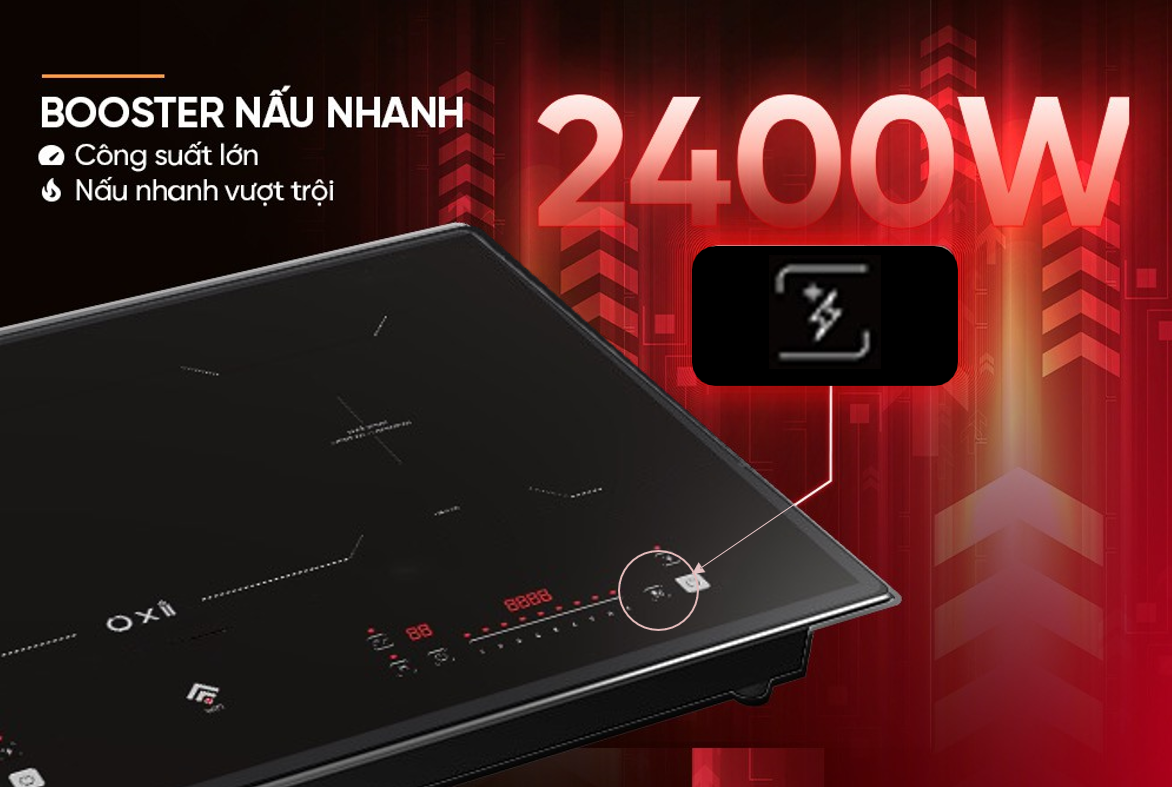 Chức năng nấu nhanh – BOOSTER giúp bếp đẩy lên mức công suất cực đại nhanh nhất, giúp gia nhiệt nhanh chóng và cho hiệu suất hoạt động lên đến 90% so với các bếp từ thông thường. Duy nhất bếp từ đôi Oxii giữ thời gian Booster trong 10’. Điều này giúp tiết kiệm thời gian và làm việc nhanh hơn trong bếp