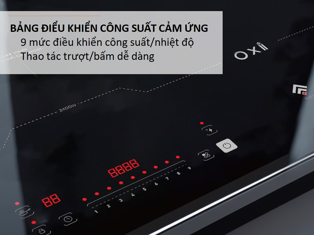Bếp có 9 mức điều chỉnh nhiệt độ/công suất với 2 bảng điều khiển riêng biệt cho từng vùng nấu. Mặt điều khiển cảm ứng nhạy bén giúp điều chỉnh nhiệt độ và các chế độ nấu nhanh chóng và thuận tiện chỉ với 1 thao tác. Người dùng thực hiện thao tác trượt tay sang trái hoặc sang phải để tăng/giảm và điều chỉnh nhiệt độ, công suất hoặc thời gian.
