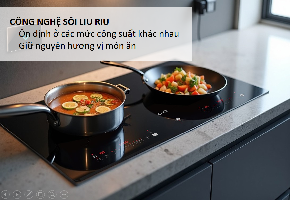 Với công suất mạnh mẽ lên đến 2400W, bếp điện từ đôi Oxii giúp nấu ăn nhanh chóng, tiết kiệm thời gian. Đặc biệt, chế độ nấu liu riu ổn định hỗ trợ tối ưu cho các món hầm, kho, giữ nguyên hương vị truyền thống.