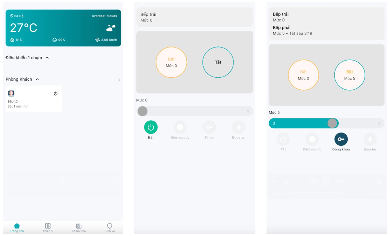 Điều khiển bằng app (bật/tắt/lựa chọn công suất) Đồng bộ trạng thái bếp qua app Kích hoạt bảo hành, theo dõi thời gian hoạt động qua app |