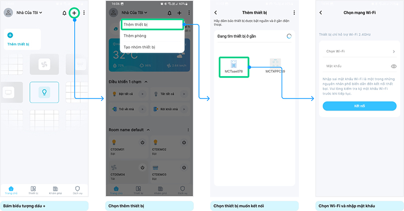 Tiếp theo trên app mở phần thêm thiết bị để tìm và kết nối với thiết bị
