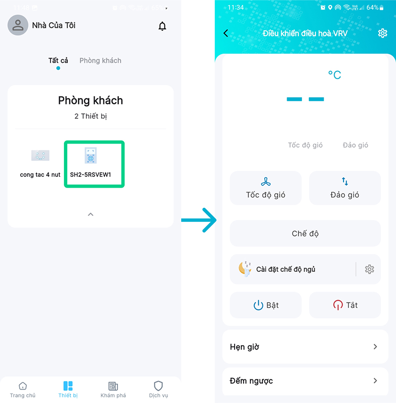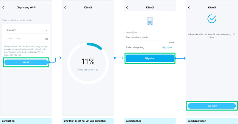 Trên ứng dụng chọn icon + -> Thêm thiết bị -> Chọn thiết bị điều khiển VRV -> Chọn Wi-Fi và nhập mật khẩu Wi-Fi -> Bấm kết nối -> Đặt tên thiết bị và chọn phòng -> Hoàn tất
