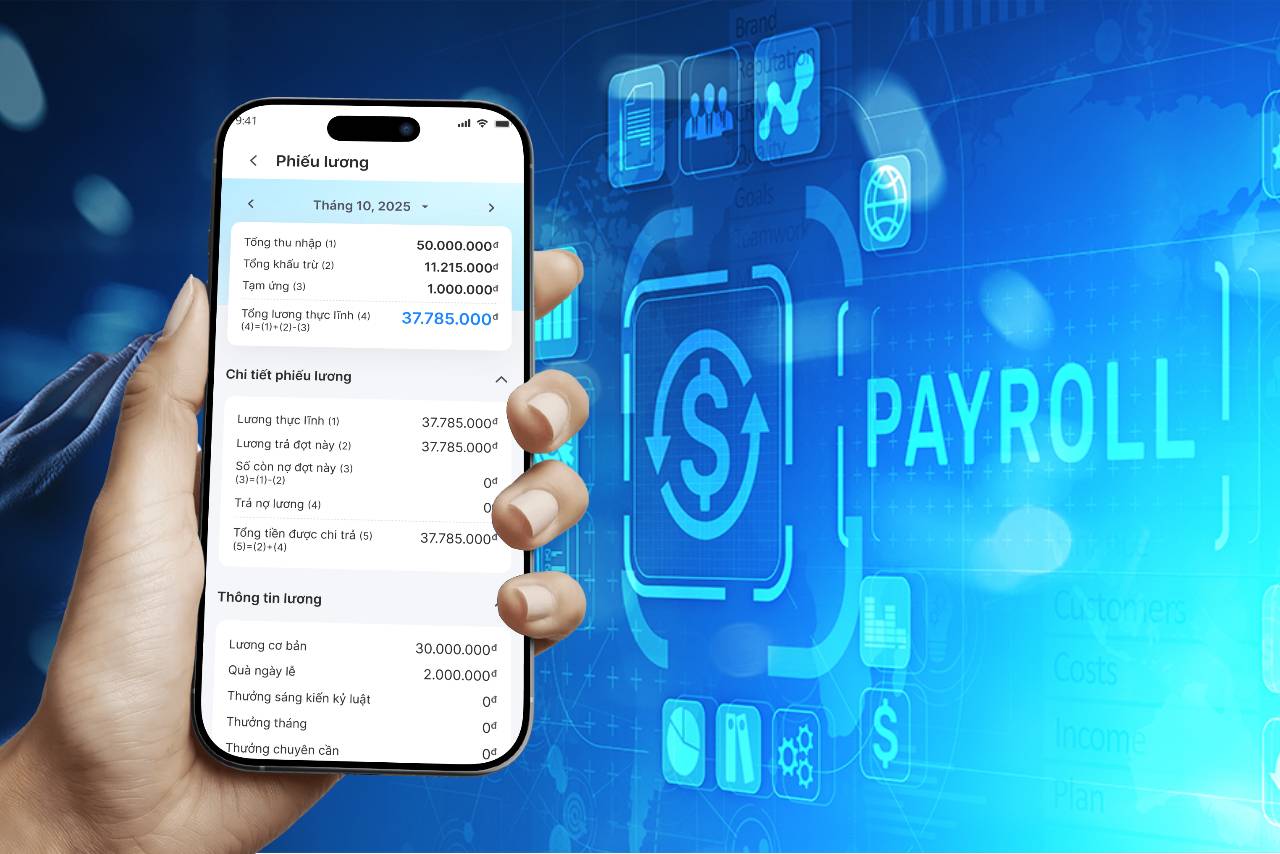 Tự động tính lương từ dữ liệu chấm công thực tế. Phiếu lương điện tử, cấu hình thuế TNCN & bảo hiểm, tích hợp với hệ thống tài chính.